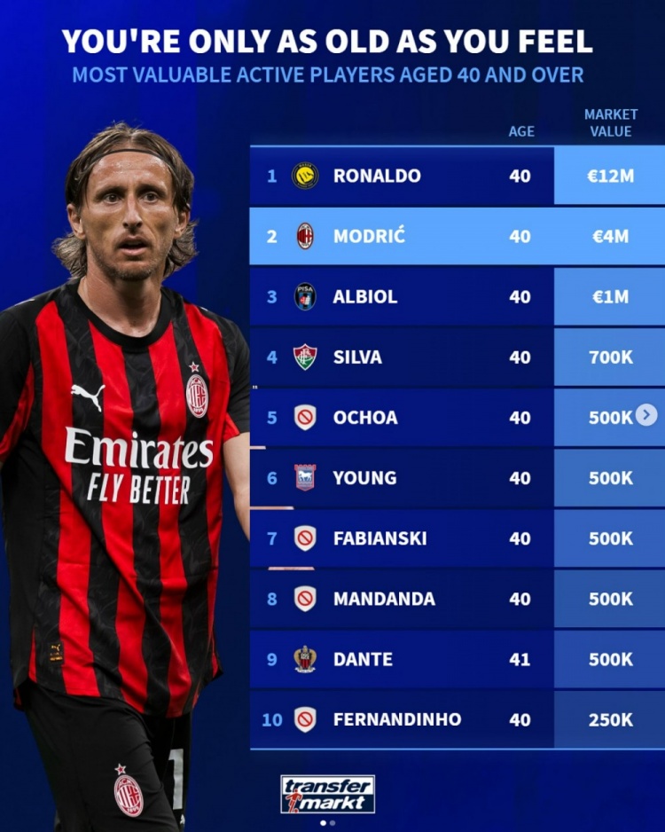 9月9日讯 莫德里奇迎来40岁生日,德转也盘点了现役足坛40岁及以上球员身价榜,其中C罗居首,莫德里奇次席,具体如下: