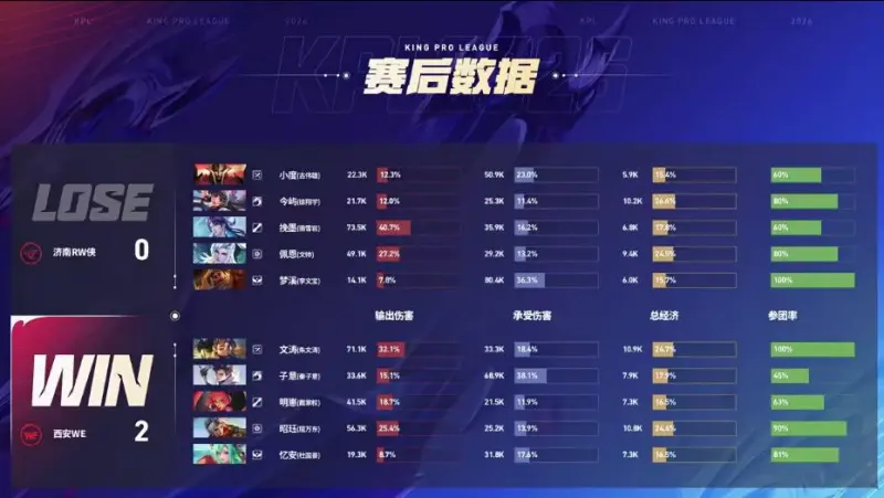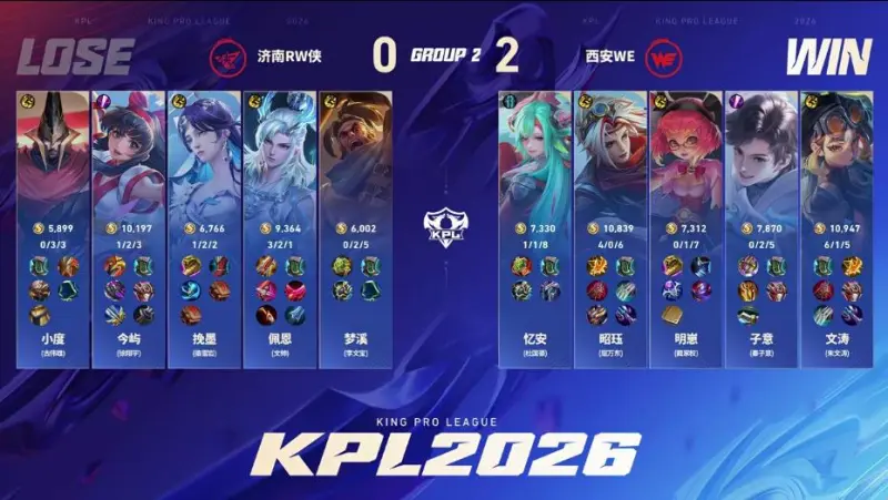 点击链接,讨论本场比赛选手表现>>王者荣耀职业联赛春季赛(BO5)Game2:蓝方:济南RW侠红方:西安WE【Ban/Pick】蓝色方禁用:盾山 狂铁 沈梦溪 女娲 马超选用:小度蒙恬 今屿娜可露露 挽墨海月 佩恩敖隐 梦溪苏烈红色方禁用:鲁班大师 空空儿 裴擒虎 橘右京 曜选用:文涛蚩姹 子意元流之子(坦克) 明崽安琪拉 昭珏戈娅 忆安少司缘【...