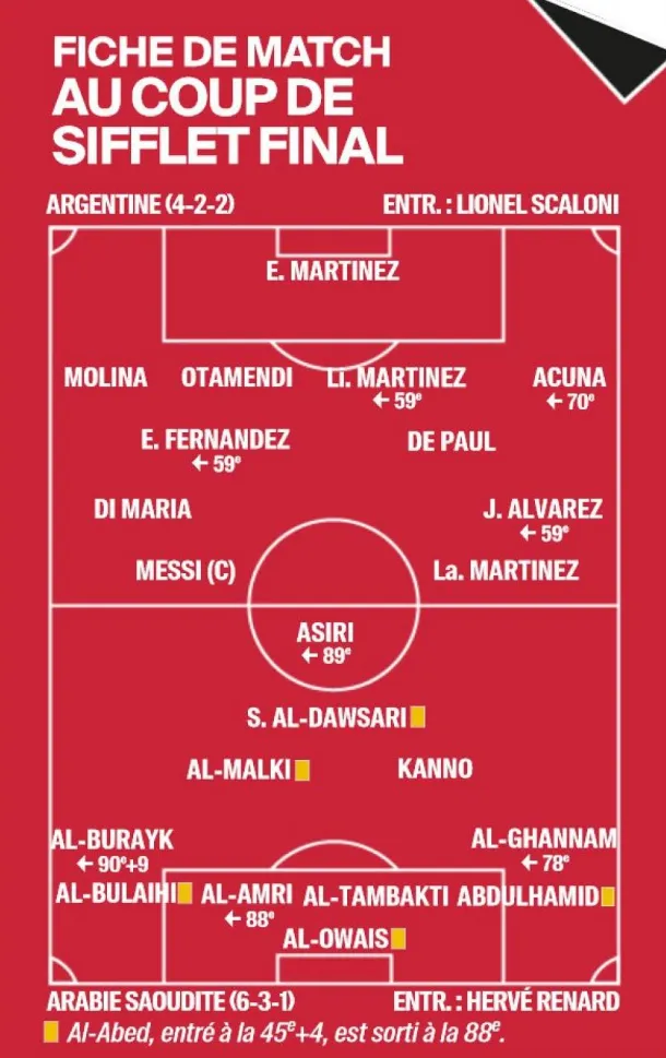 “我独自一人在更衣室里待了很久。球员们在场上庆祝。当他们回来时,现场一片疯狂。我很高兴,但也有些许拘谨。我们参加的这项赛事并没有因为这场比赛而结束(沙特阿拉伯随后以0-2负于波兰,又以1-2负于墨西哥,并在第一轮就被淘汰)。但我知道我正在经历一个难忘的时刻。那天晚上,我的手机里收到了142条短信。”