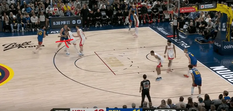 火箭进攻被逼至底线附近,约基奇及时提上封锁了小史密斯的接球线路: