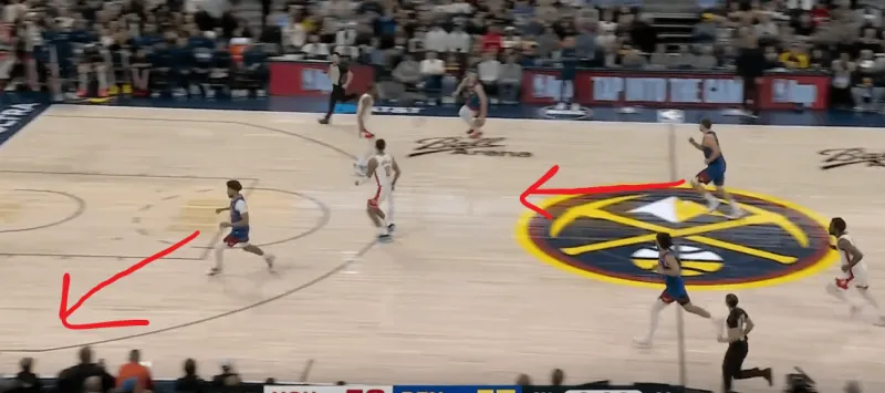 掘金阵地战为穆雷设计的横向zoom发起,由布劳恩设置掩护再和约基奇手递手发起,穆雷选择拒绝布劳恩掩护直接切入,约基奇心领神会直塞穆雷反跑空切扣空篮得分: